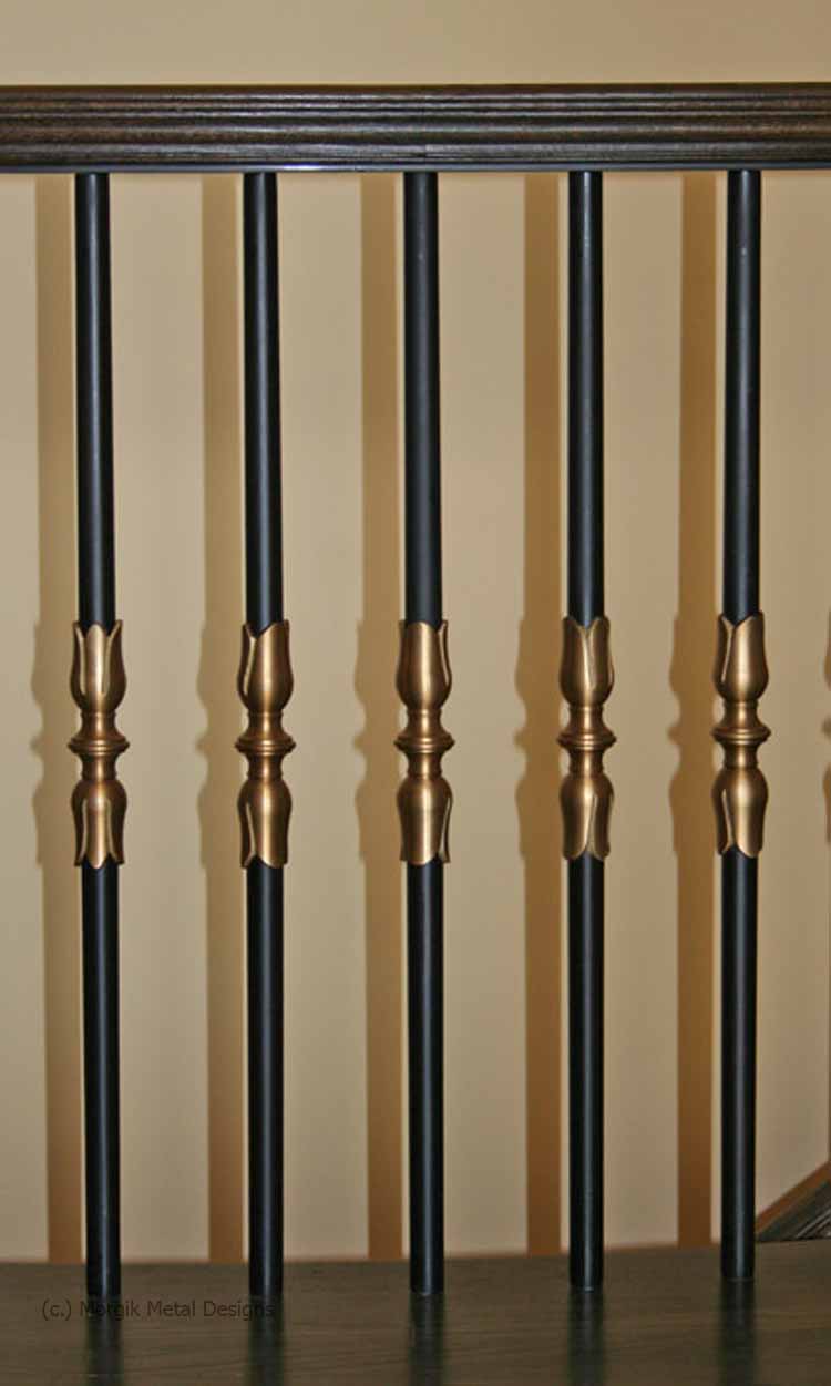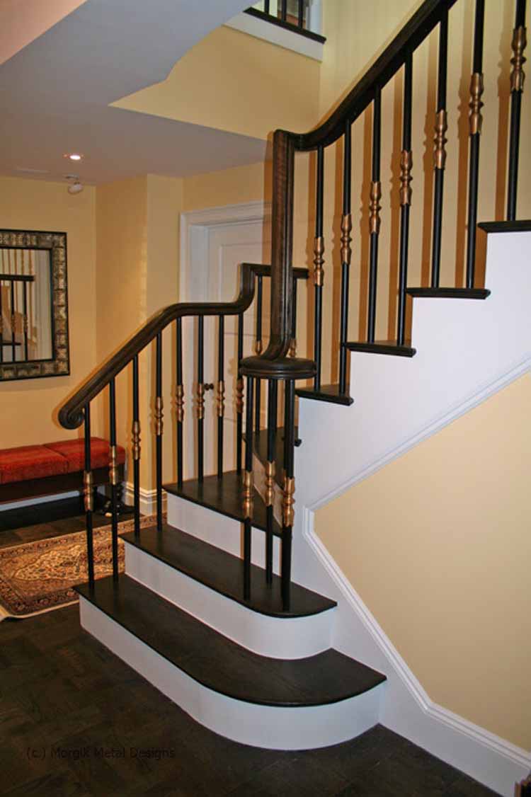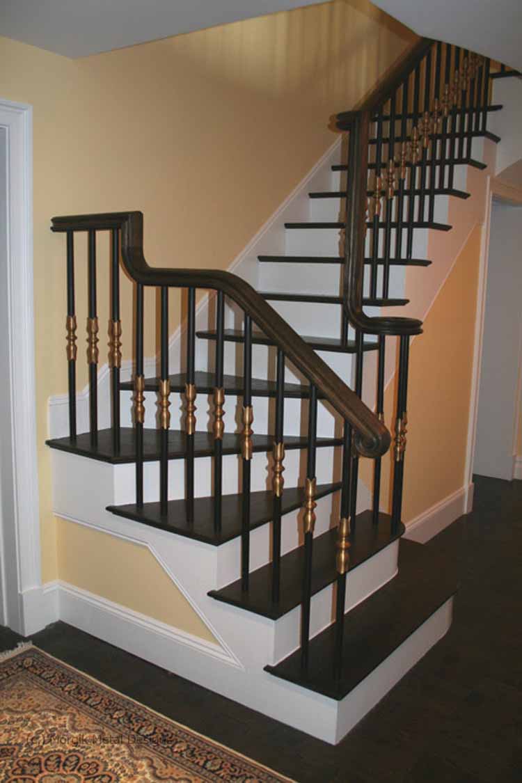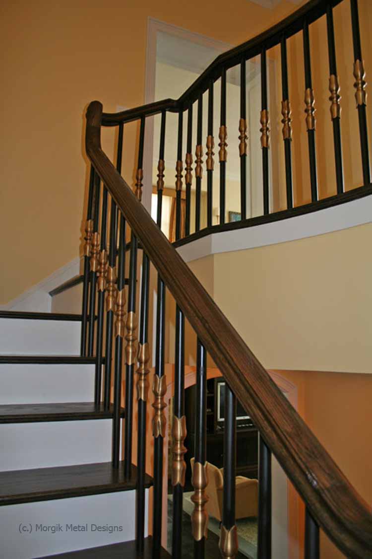 Custom steel and brass spindle rail with wood cap. Finish; Matte Black and Brushed Brass