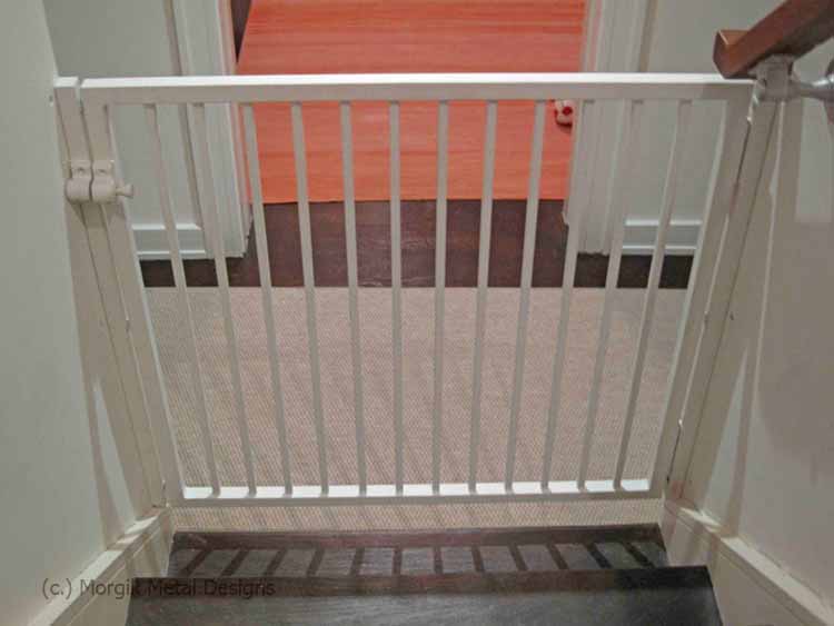 Custom steel picket style baby gate. Finish; Custom white to match walls
