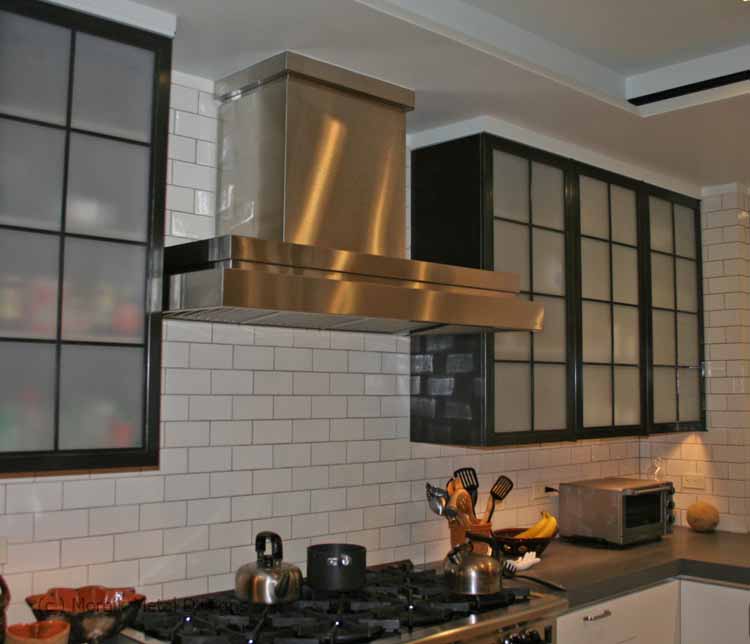 Custom cabinet frames and island microwave unit. Finish; Cabinets – chemical patina | Island unit – Gun metal