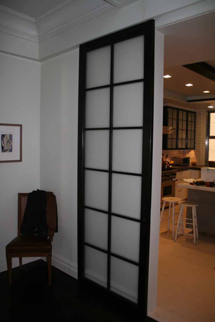 Custom steel sliding partition door. Finish; Chemical Patina (blackened steel)
