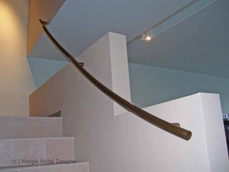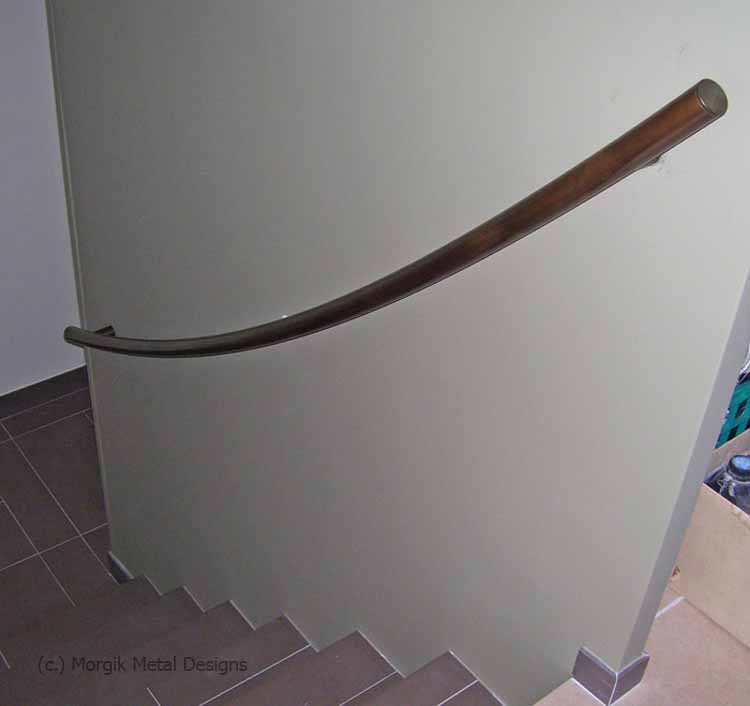 Custom brass curved wall mounted pipe rail. Finish; Tarnished Brass