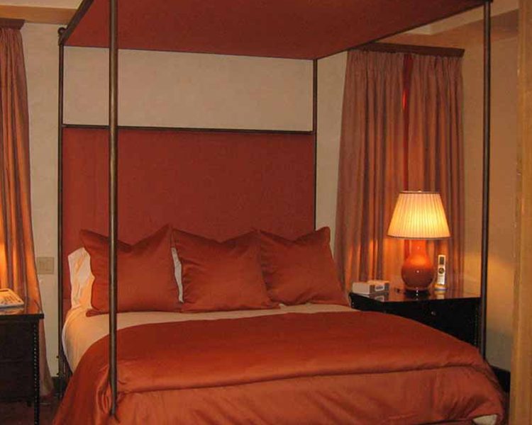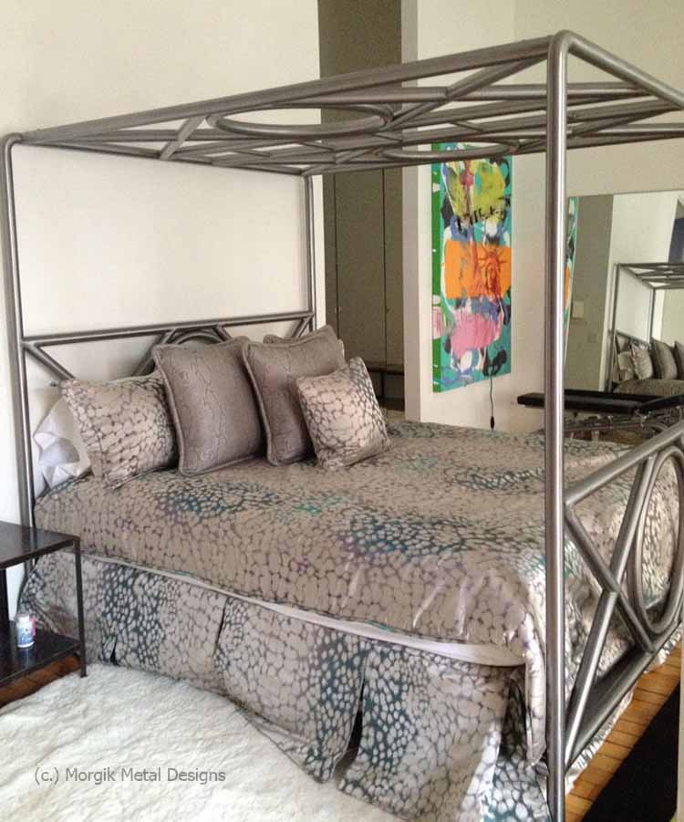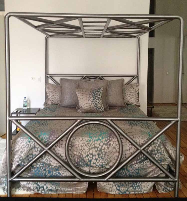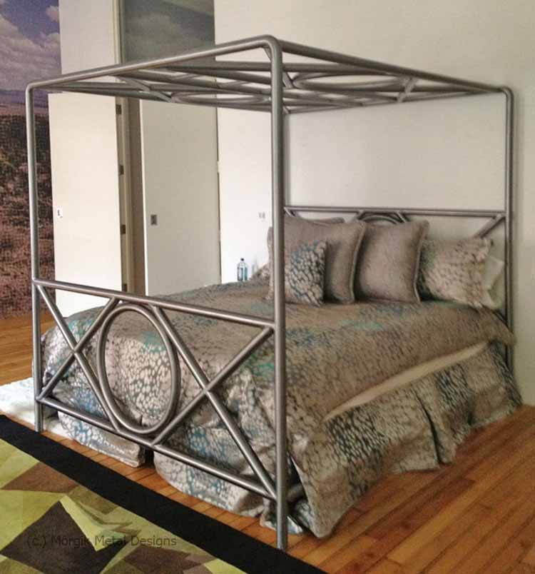 Custom steel bed with decorative 4 poster design. Finish; Brushed Steel