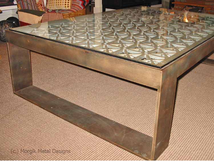Custom flat stock steel table base with inset antigue gate panel. Finish; Antique Bronze base, Champagne gate