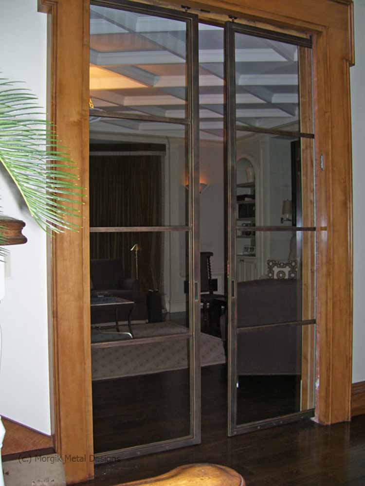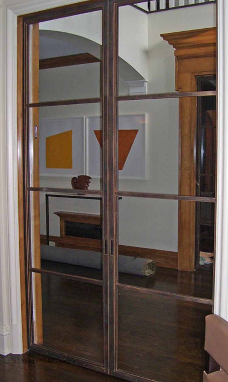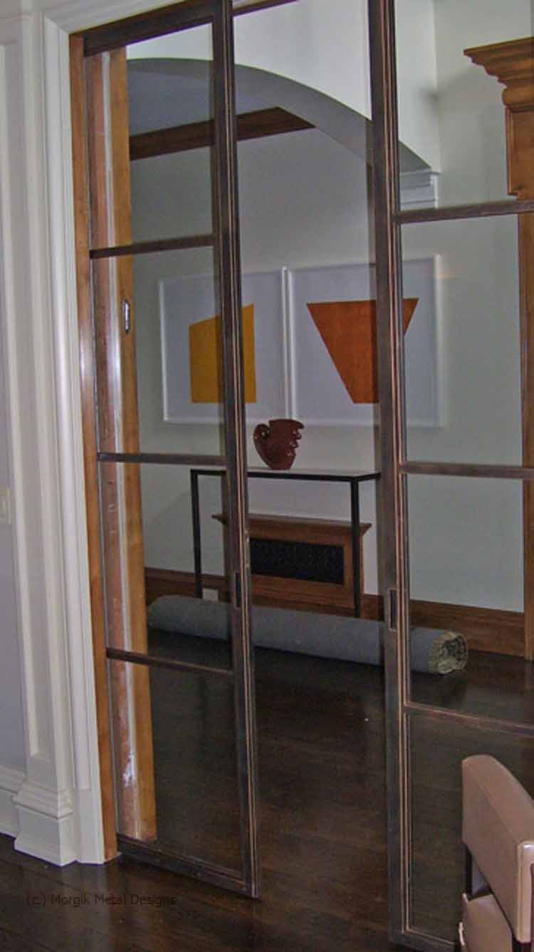 Custom steel sliding partition doors. Finish; Antique Bronze