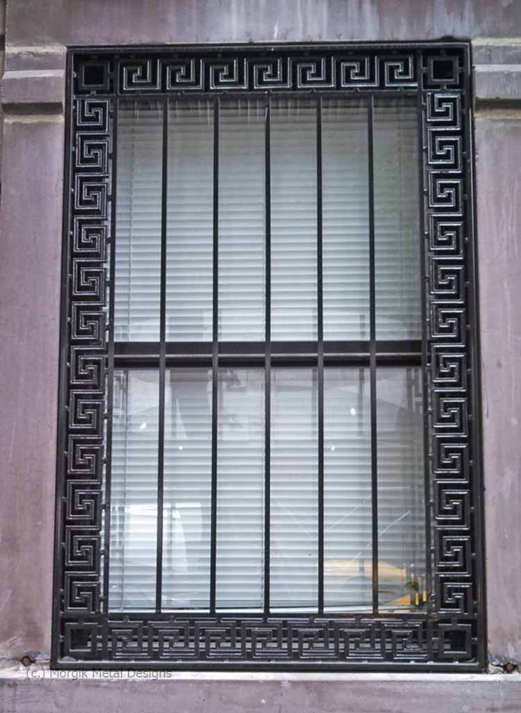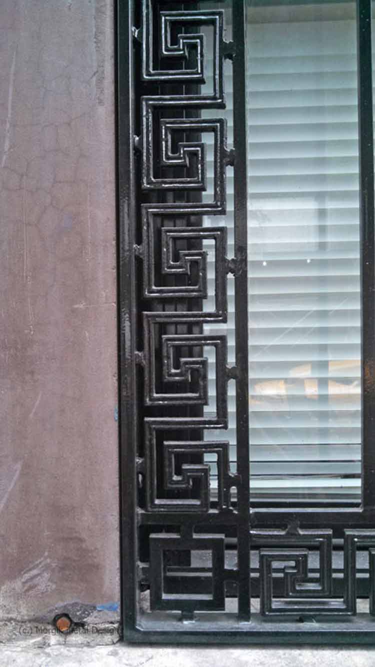 Custom steel window grille with greek key design. Finish; Powder coated black