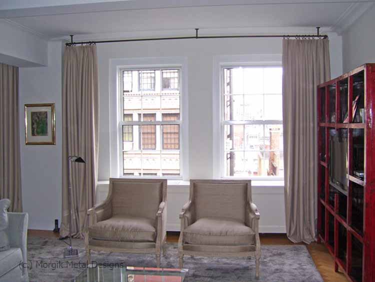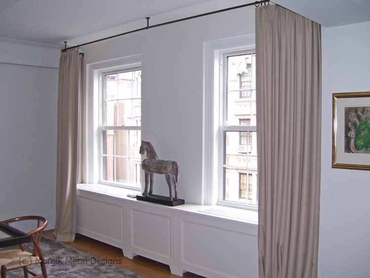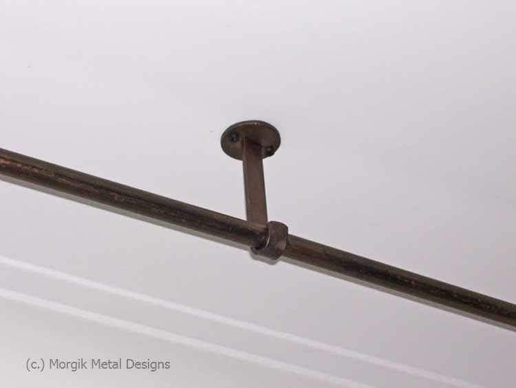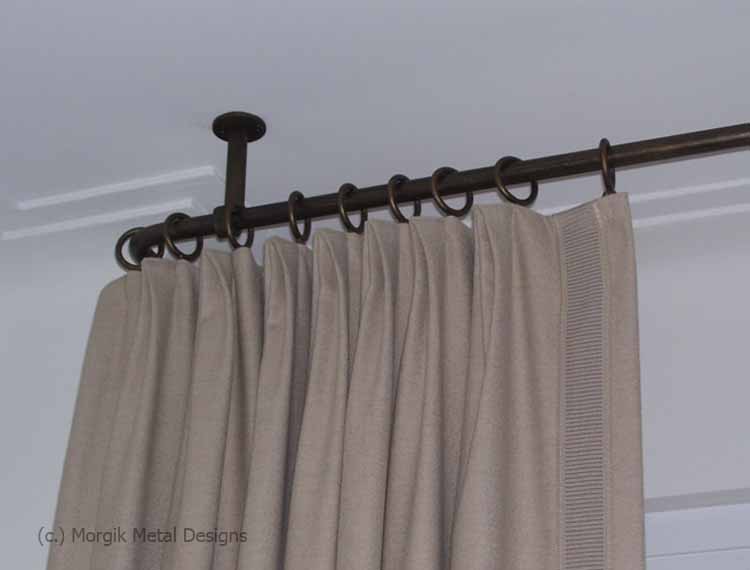 Custom brass drapery hardware with ceiling mounted brackets. Finish; Tarnished Brass