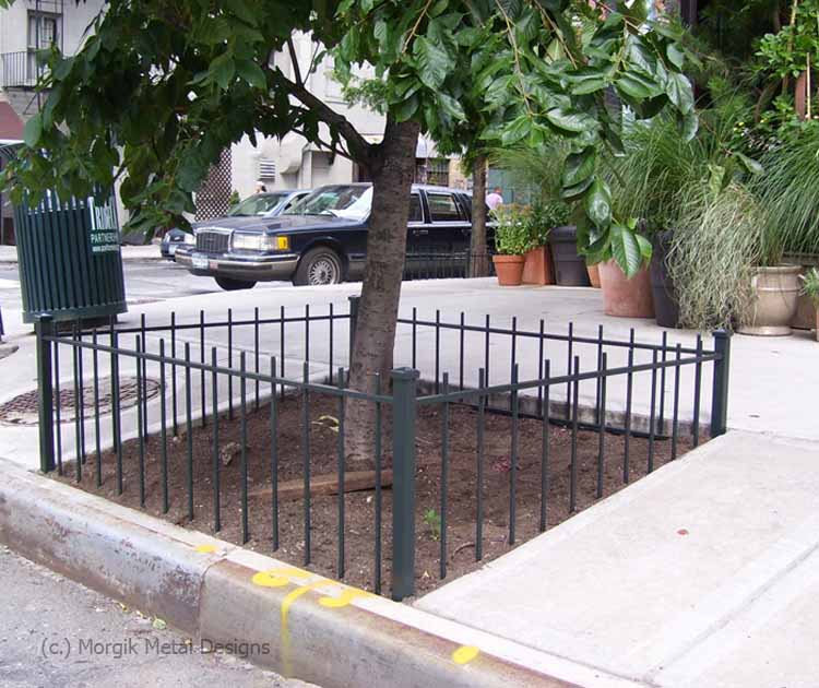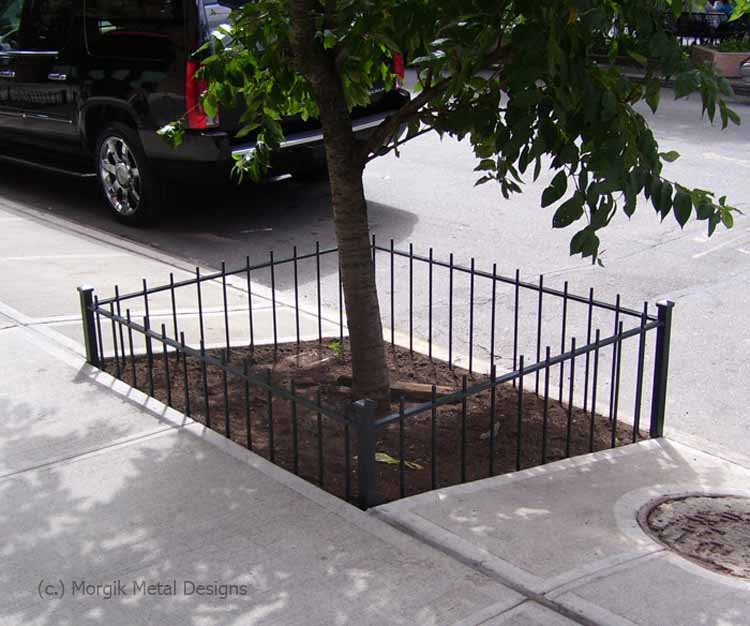Custom steel tree guard with slopped bottom rail to follow side walk. Finish; Powder coated custom black