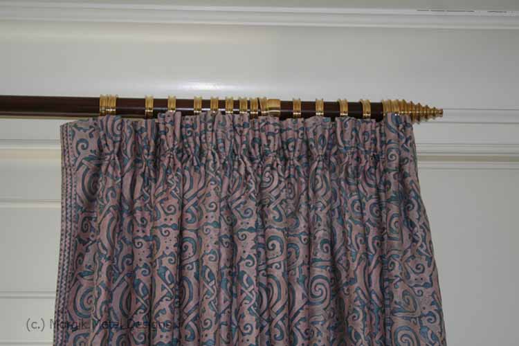 Wood poles with custom brass rings and finials. Hardware in polished brass.