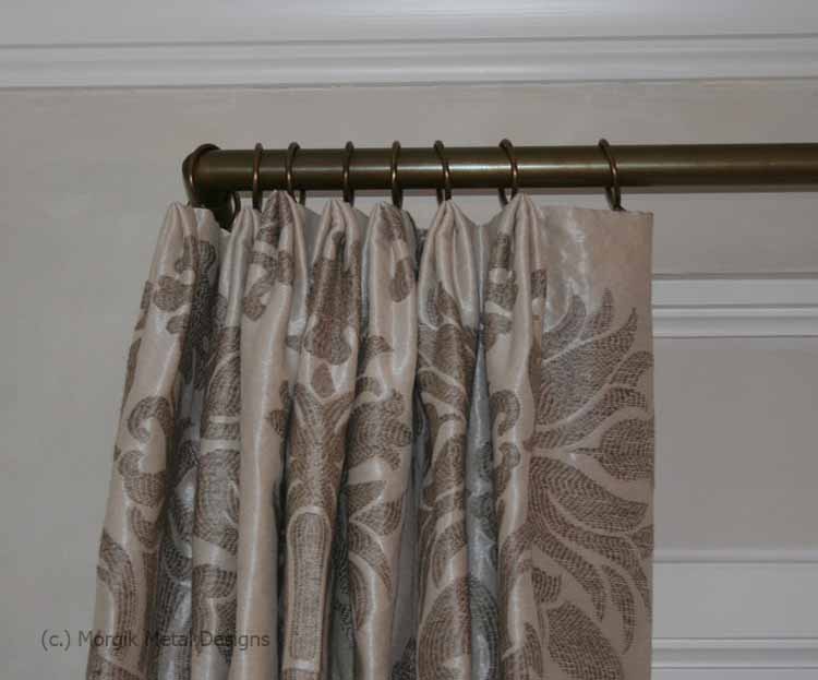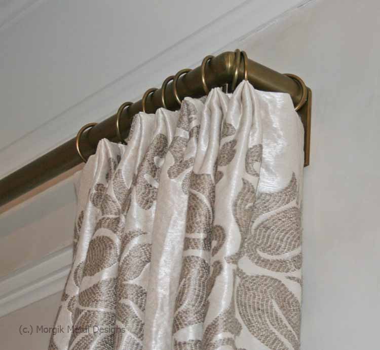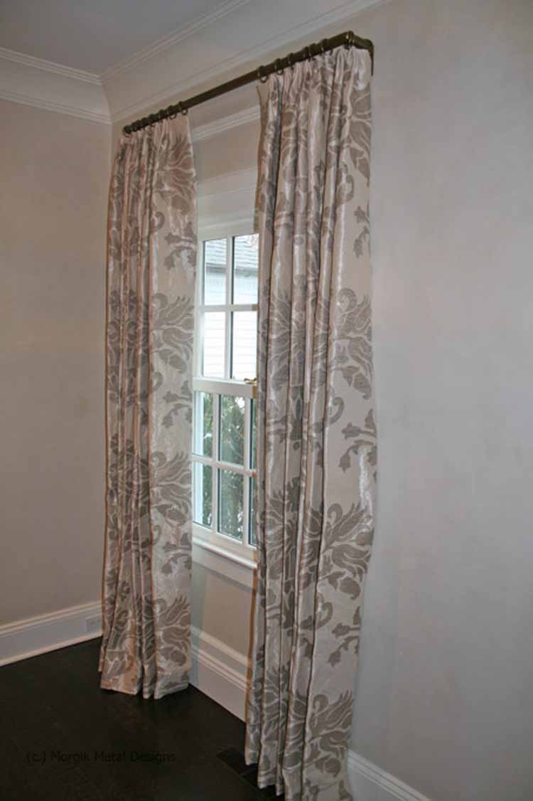 Custom drapery rod with mitered returns. Finish; Tarnished Brass