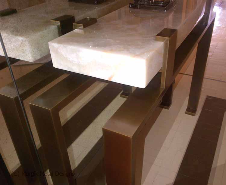 Custom brass console table for stone top. Finish; Tarnished Brass