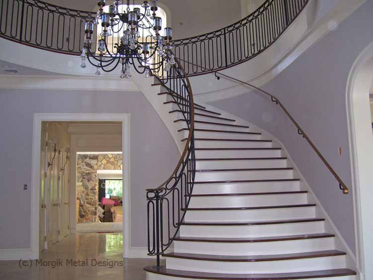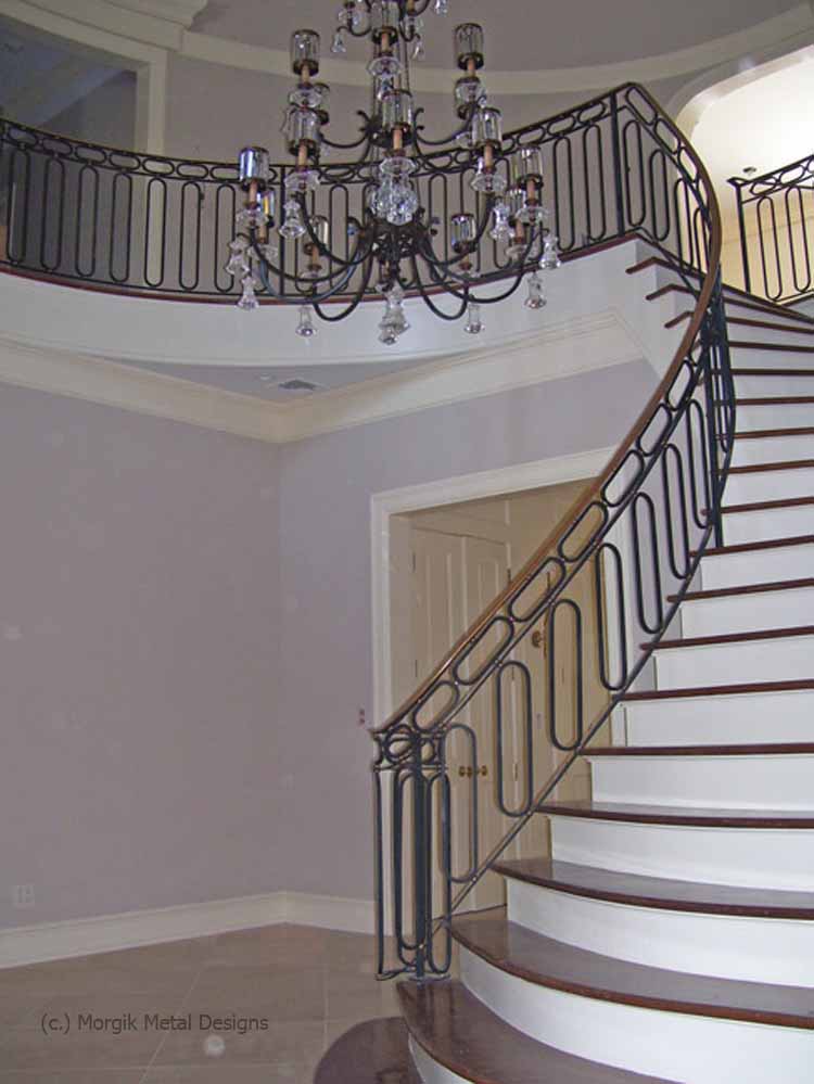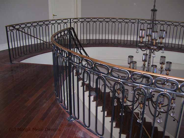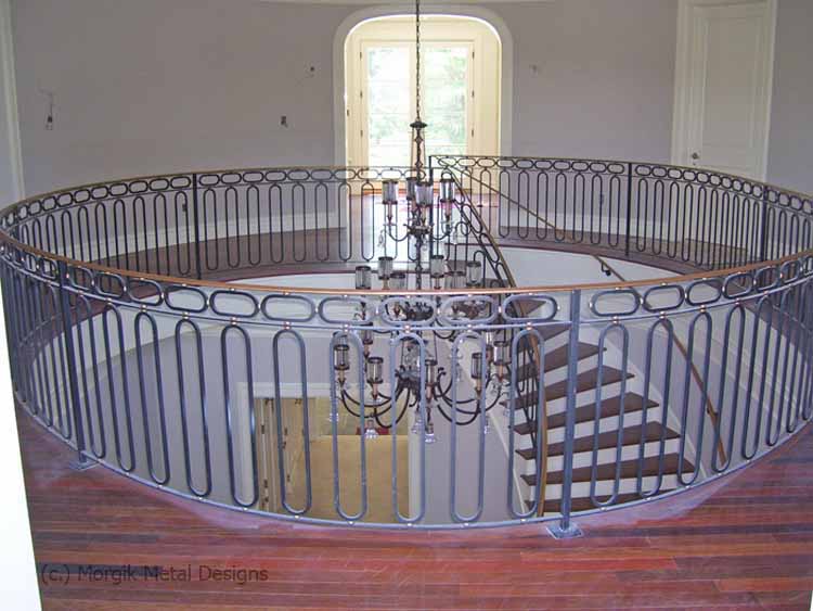 Custom steel railing with oval shaped detail. Finish; Natural Black with Antique Gold Brushed toprail