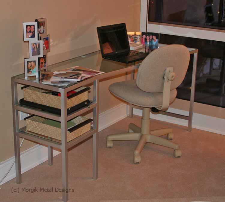 Custom steel desk with inset glass top and shelves. Finish; Brushed steel