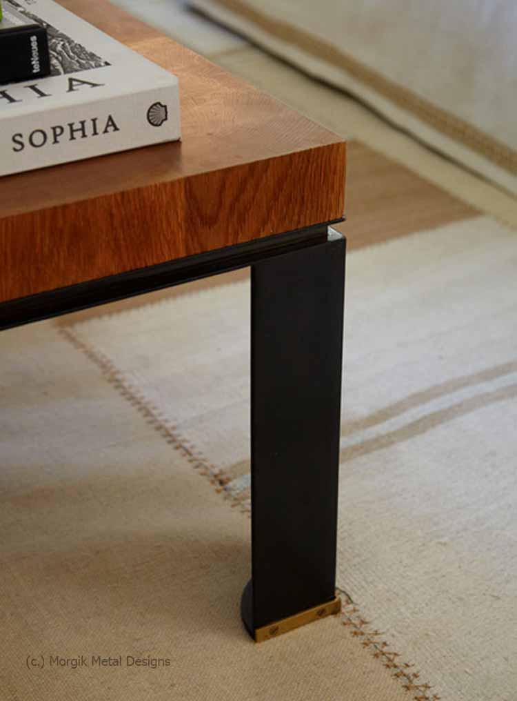 Custom table base for wood top by others. Finish; Chemical patina black with polished brass foot accents