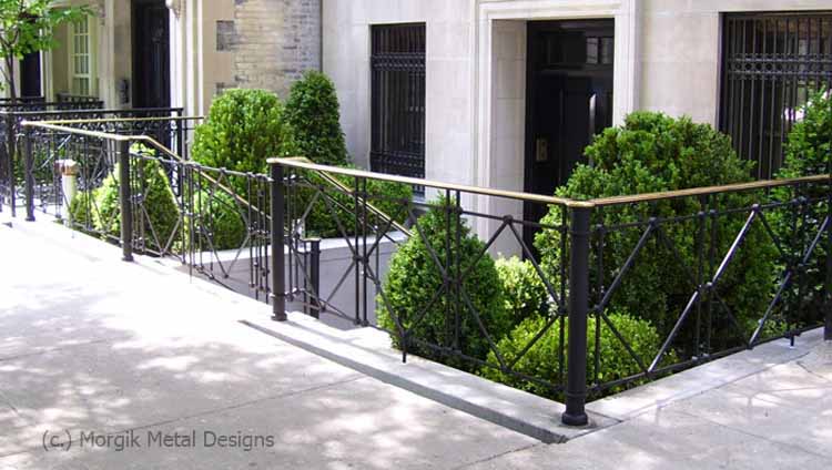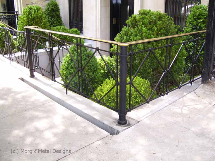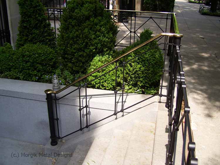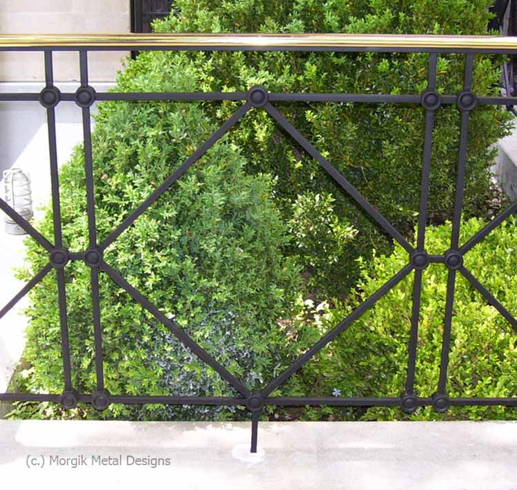 Wrought iron rail with custom round medallions and brass top rail. Finish; Natural black with polished brass